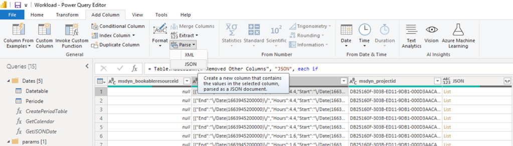 We retrieve the Project Assignments (msdyn_resourceassignment) and use the “msdyn_plannedwork” contour. Power BI supports adding a new Column with “Parse JSON”.